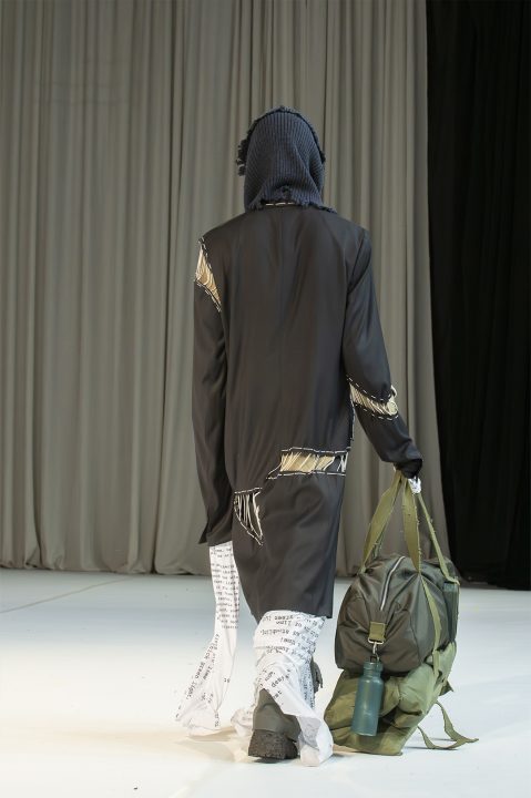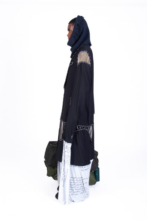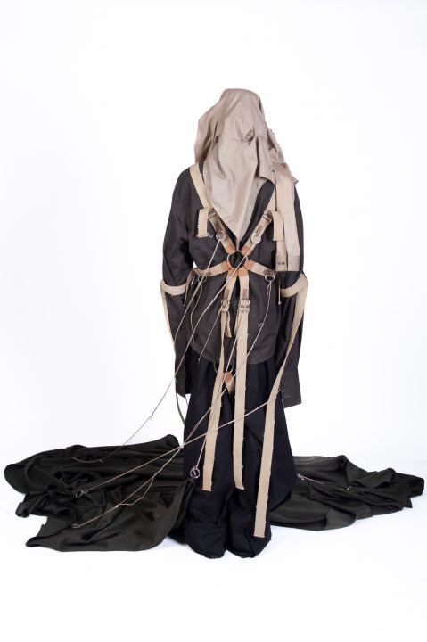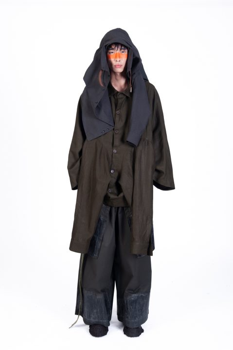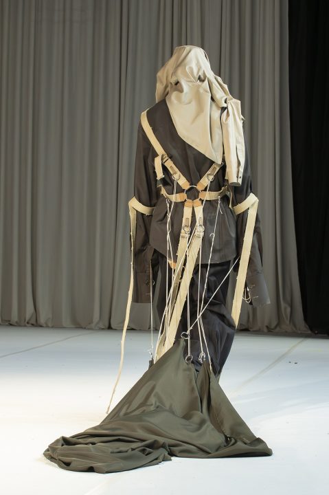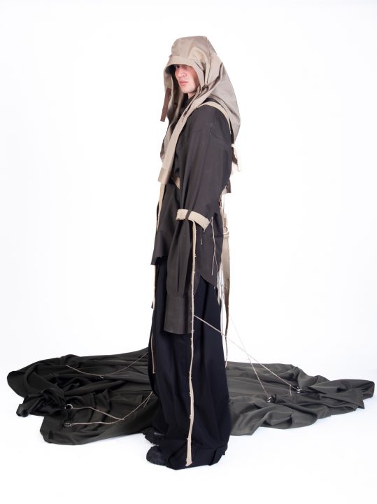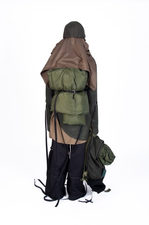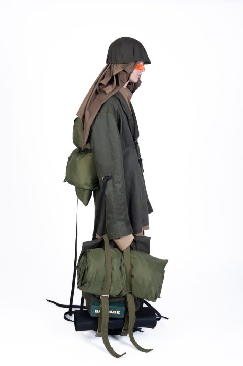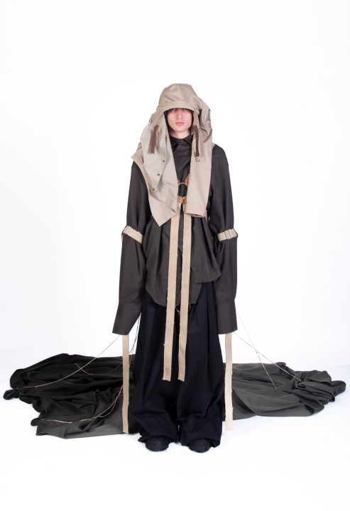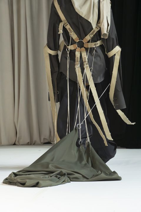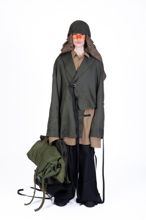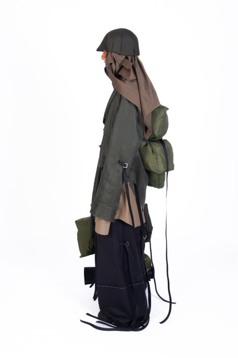A alfaiataria aparece como base estrutural, mas é desconstruída, desconectada, fragilizada. Os elementos utilitários e militares, como alças, cordões, bolsos externos, travas e aviamentos, são resignificados. Camisas sobrepostas e carregadas no corpo evocam as múltiplas versões de si mesmo, fragmentos de identidade, companheiros feridos, ecos de guerra. Um paraquedas sendo arrastado, que antes era símbolo de salvação, agora é o peso do passado que o acompanha.