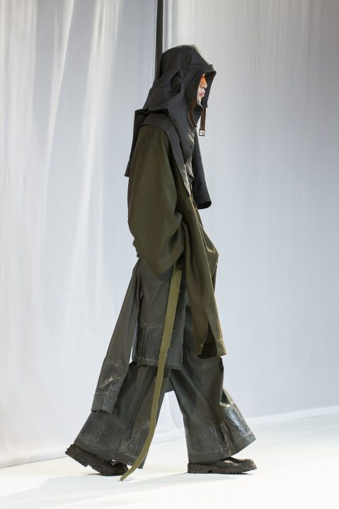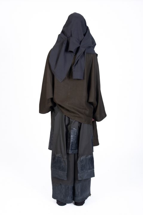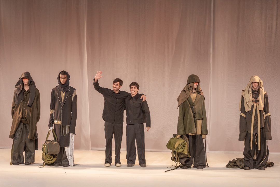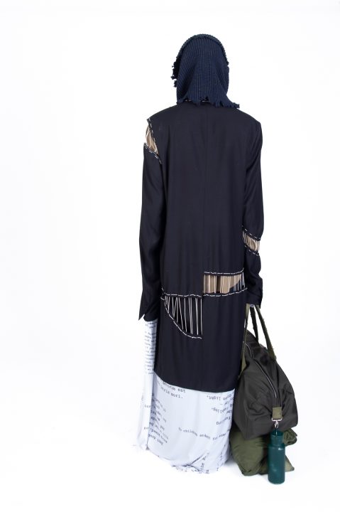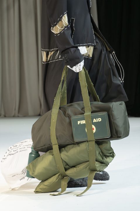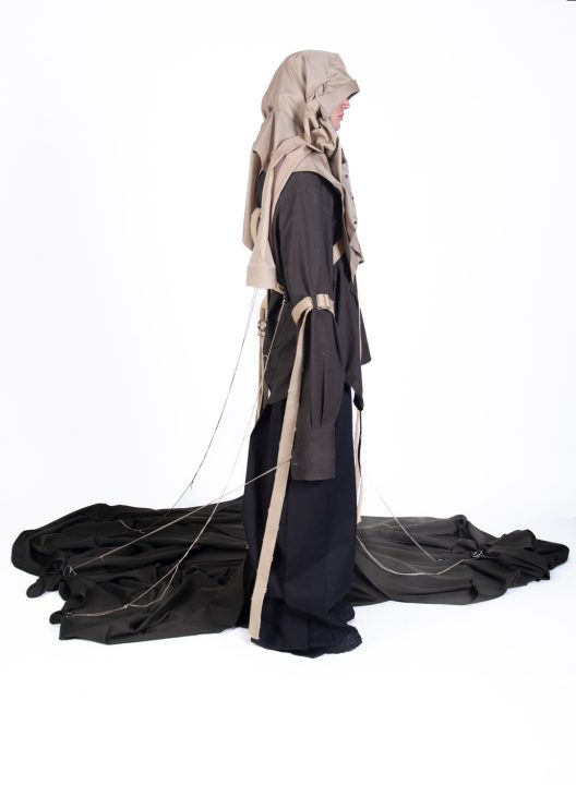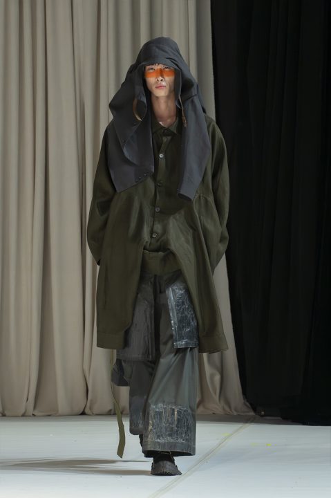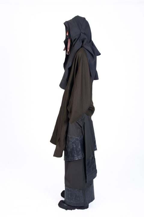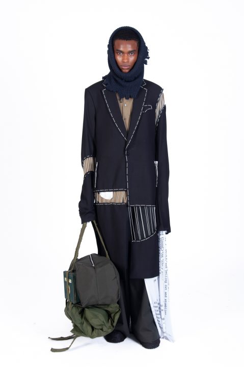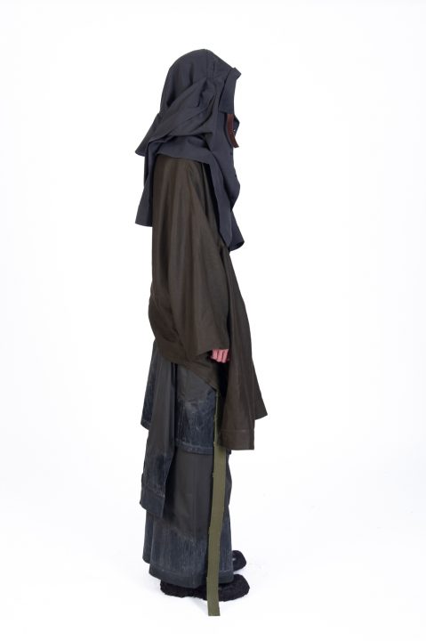 A alfaiataria aparece como base estrutural, mas é desconstruída, desconectada, fragilizada. Os elementos utilitários e militares, como alças, cordões, bolsos externos, travas e aviamentos, são resignificados. Camisas sobrepostas e carregadas no corpo evocam as múltiplas versões de si mesmo, fragmentos de identidade, companheiros feridos, ecos de guerra. Um paraquedas sendo arrastado, que antes era símbolo de salvação, agora é o peso do passado que o acompanha.